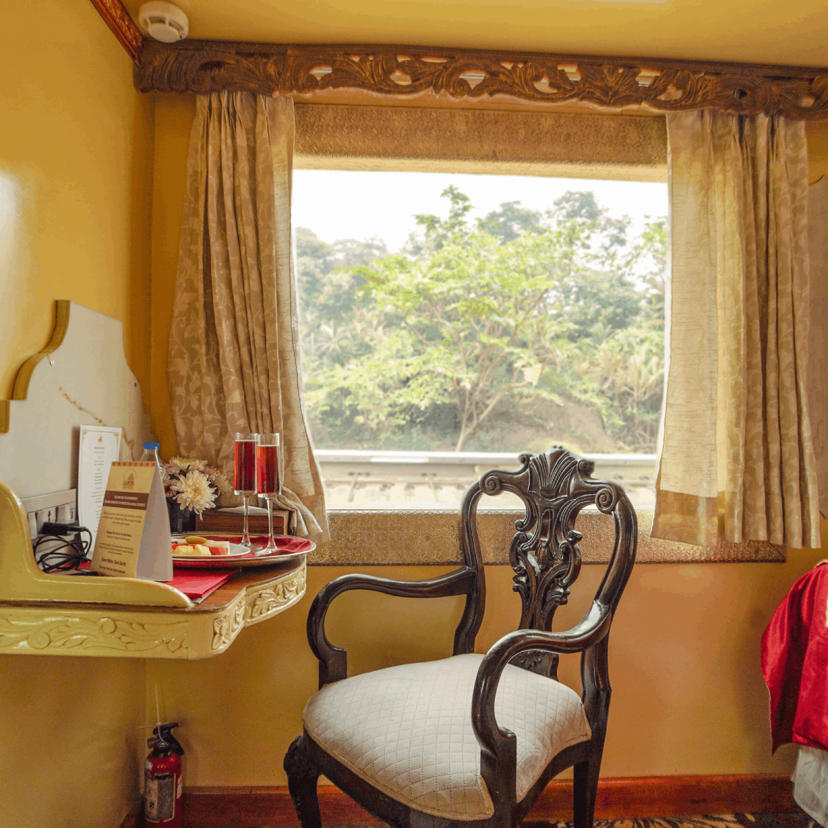 Luxury amenities such as high-quality toiletries are provided to enhance your royal stay. A large window is positioned right beside the bed, allowing you to enjoy the beautiful views of the changing landscapes throughout your journey.